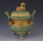 明素三彩贴狮首狮钮盖双耳三足陶香炉